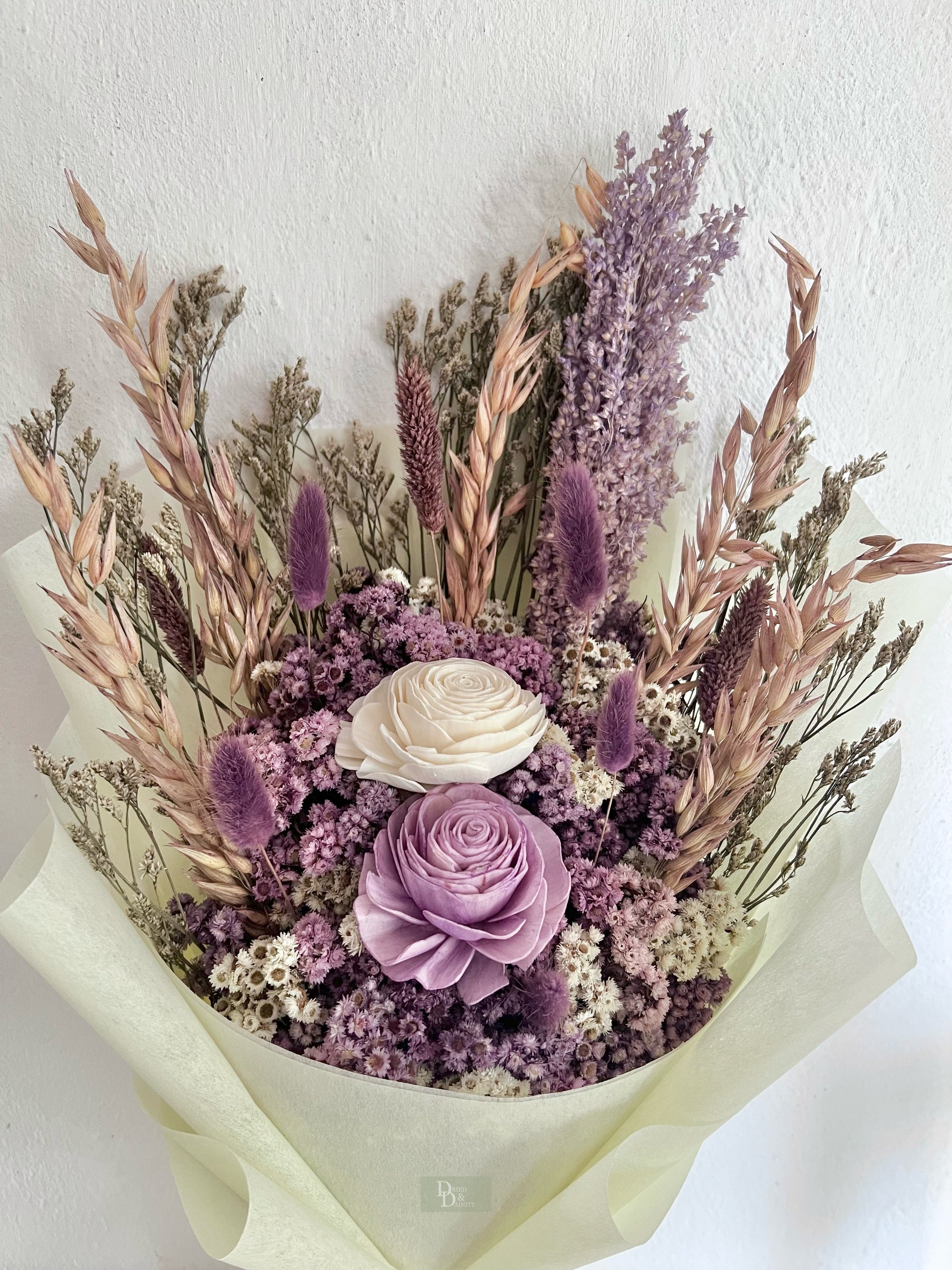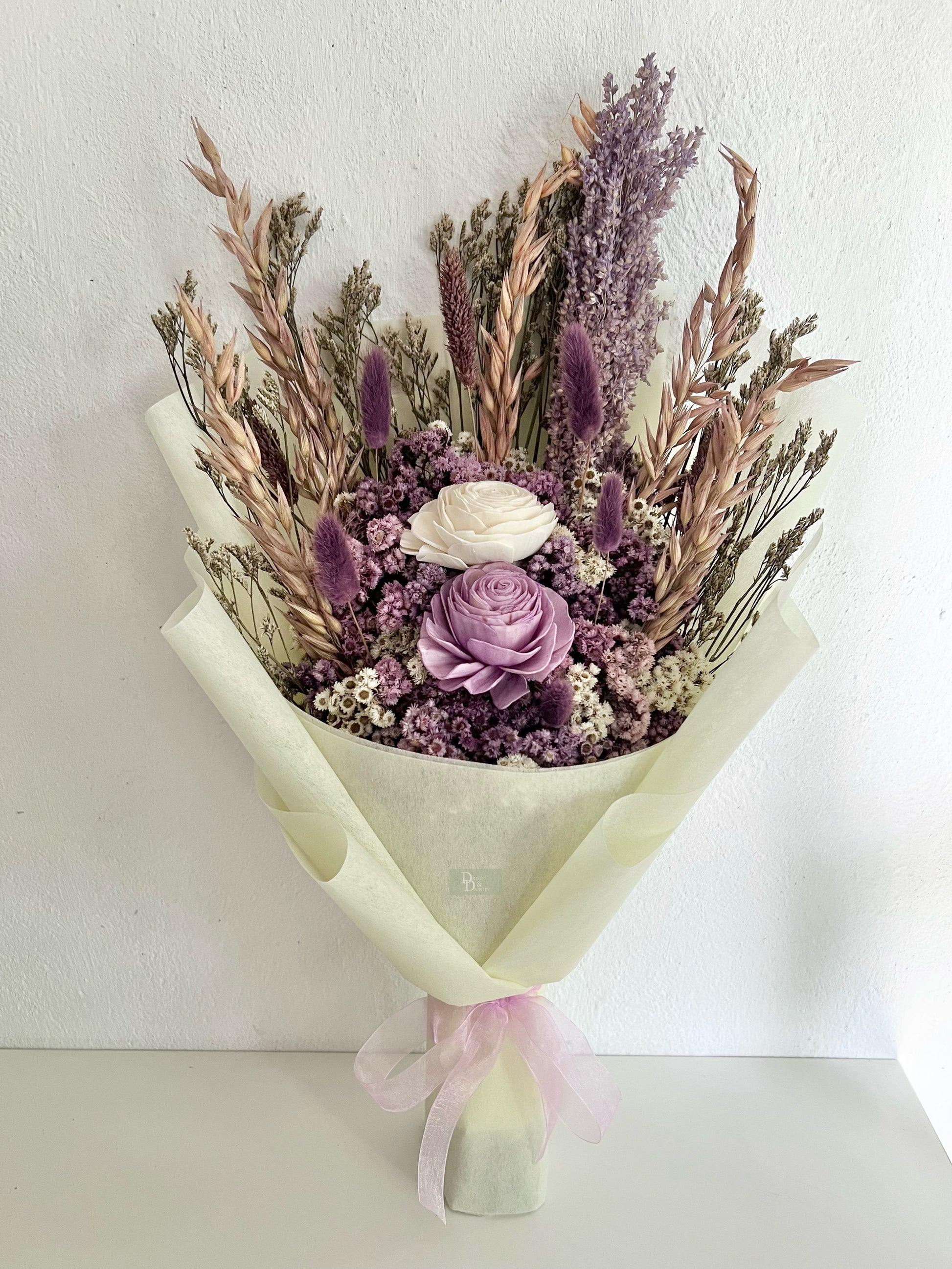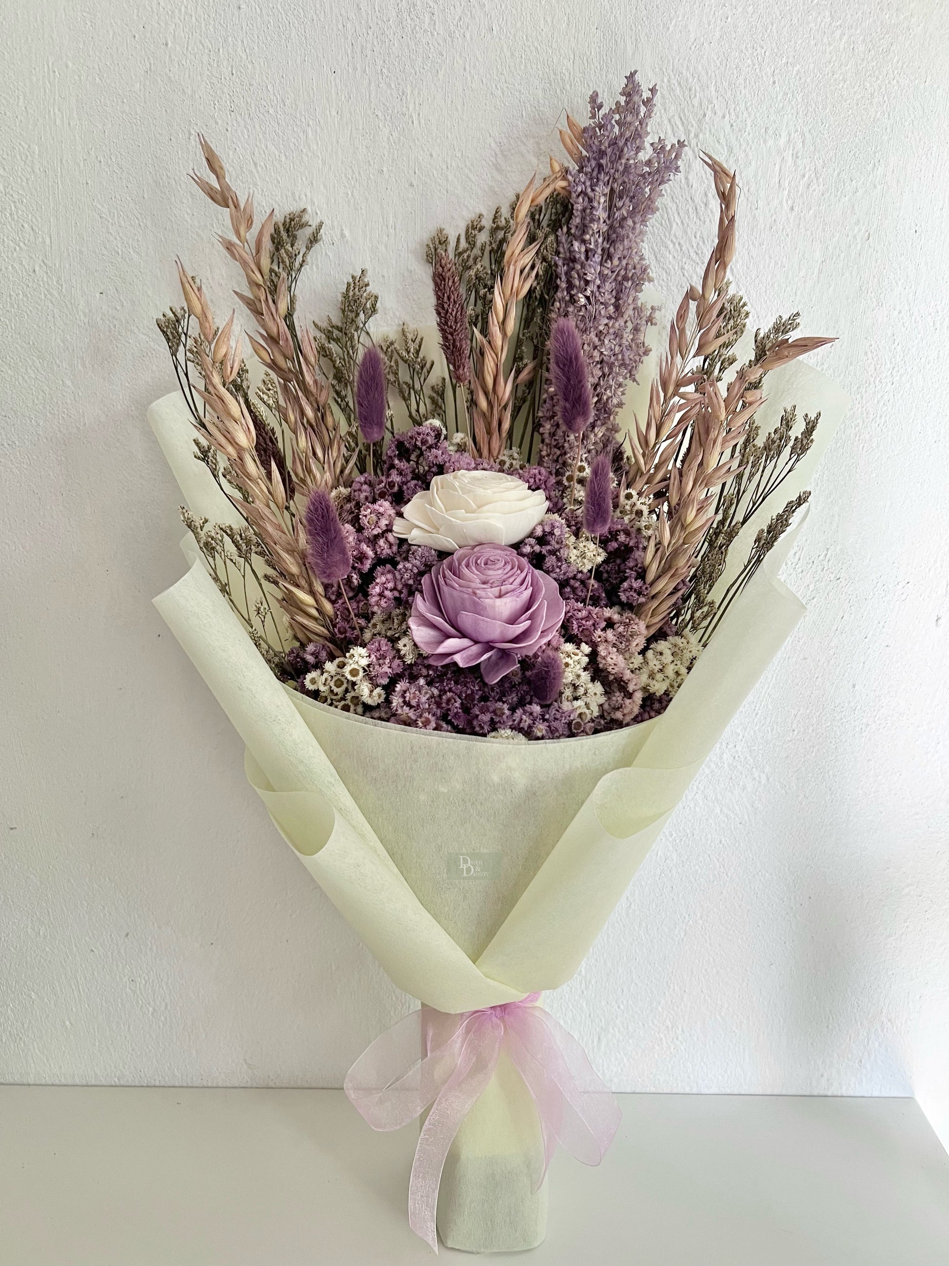 A dreamy arrangement inspired by the soothing charm of lavender fields. This hand-tied bouquet features a curated mix of premium dried and sola flowers in soft lavender, lilac, and ivory tones. Designed to last for years, it’s perfect for weddings, home styling, and gifting.